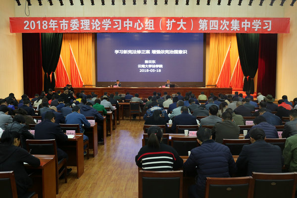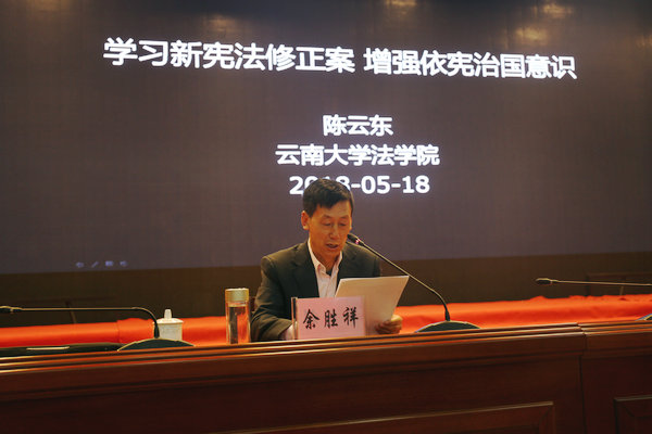 5月18日上午,香格里拉市委理论学习中心组举行2018年第四次集中学习,专题学习宪法修正案。州委副书记、香格里拉市委书记余胜祥主持会议并作总结讲话。 会议邀请云南大学法学院党委书记、教授、法学博士陈云东作《学习新宪法修正案,增强依法治国意识》专题辅导讲座。